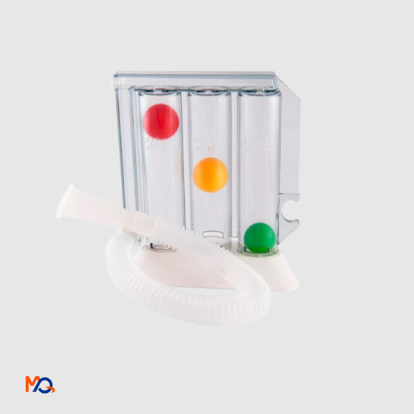 Le spiromètre incitatif est composé de trois chambres transparentes. Chacune contient une boule mobile qui monte lors de l’inspiration. Un tube relié aux trois chambres permet au patient d’inspirer directement dans le dispositif. Cette conception facilite la visualisation de l’effort respiratoire.